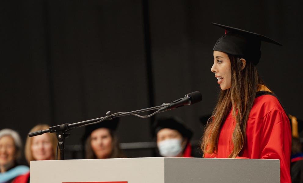 واختيرت الباحثة مريم عدنان البحر لإلقاء كلمة الخريجين، حيث أكدت أن تخصصها في هذا الحقل المعرفي المتعلق بتوفير الحياة الصحية للأطفال ومساعدتهم ومساعدة أسرهم “يمثل قيمة إنسانية كبيرة ذات مردود اجتماعي واسع”.